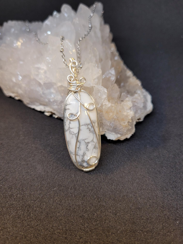 Howlite sertie à l'aide de fil de cuivre argenté anti-ternissement et sa chaîne en acier inoxydable.
