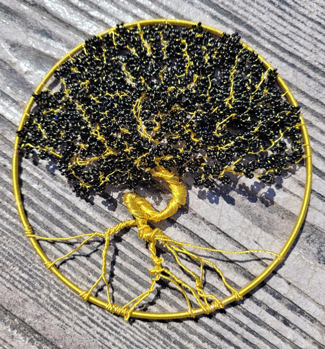 Ce cercle de 15cm de diamètre décoré de son arbre de vie en fil or et perles noires fera une magnifique suspension dans votre salon ou dans une chambre.
