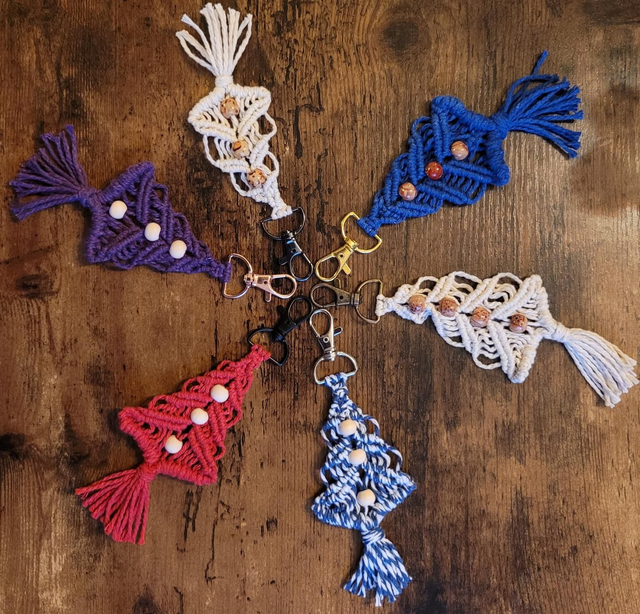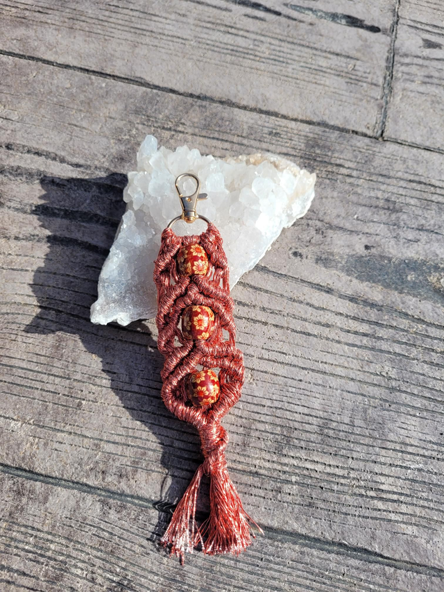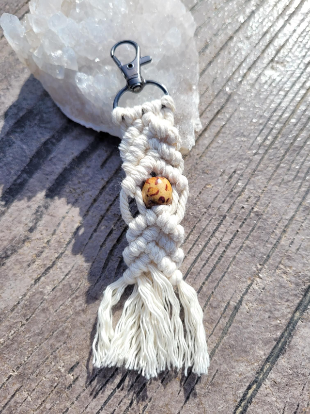 Porte-clefs, bijou de sac ou encore suspension décorative en macramé avec ou sans perles en bois.