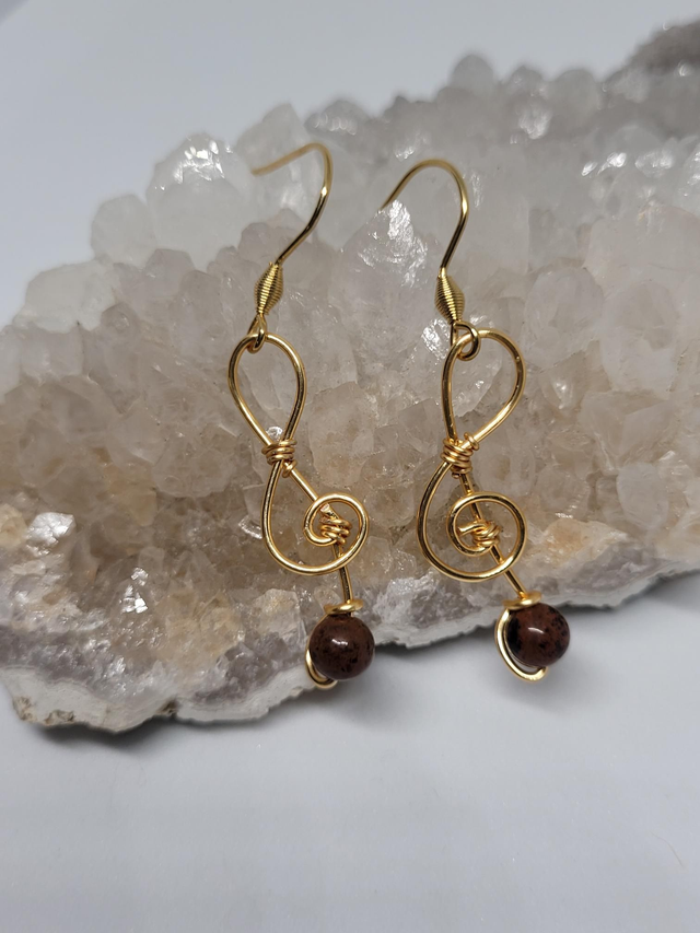 Boucles d’oreilles en fil de cuivre doré anti-ternissement en forme de clefs de sol et ses perles en pierre : Larkivite ou Obsidienne acajou. Crochets en acier inoxydable.