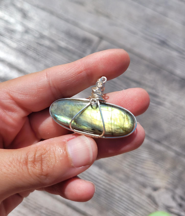Labradorite sertie à la main avec attention et passion à l'aide d'un fil de cuivre argenté.