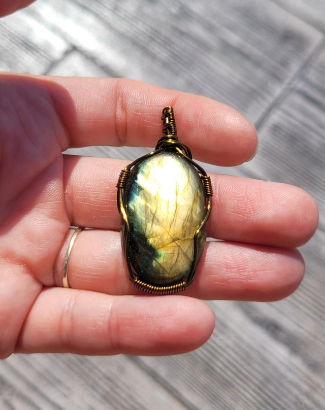 Labradorite sertie à la main dans mon atelier à l'aide d'un fil de cuivre bronze antique anti-ternissement .