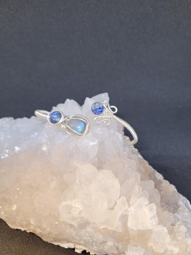 Jonc ouvert en fils de cuivre argenté anti-ternissement, labradorite et perles de lapis-lazuli.